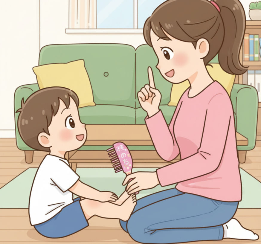 まず、パパやママが自分の手の甲を「魔法のくし」で優しく撫で、「わぁ、気持ちいい〜!」と大げさなくらいリラックスした表情を見せます(=モデリング)。